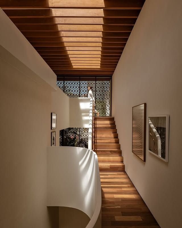 Neste projeto, a escada recebeu iluminação natural e complementar técnica para valorizar formas e texturas.